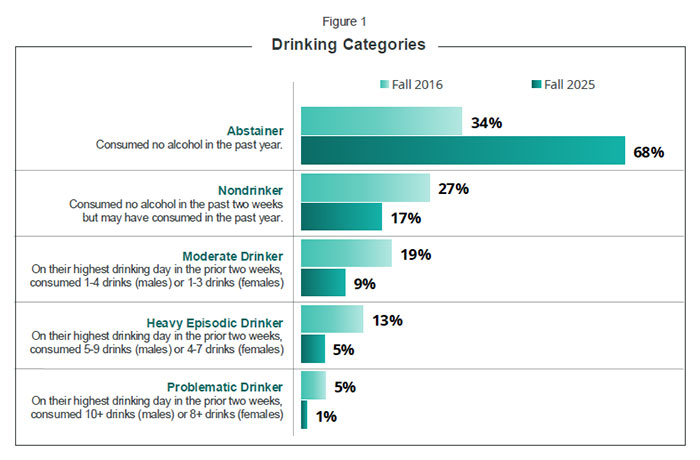 The report analyzes aggregated data from 832,260 students across 723 colleges, universities, and organizations who participated in at least one of a select group of educational training courses offered by Vector Solutions. It found the number of students who do not drink at all has doubled since 2016, increasing from 34% to 68% (Figure 1).Younger students are leading the shift in abstinence, the report says, with 71% of students age 19 and under reporting no drinking in the past year compared to 47% of those 20 and older.