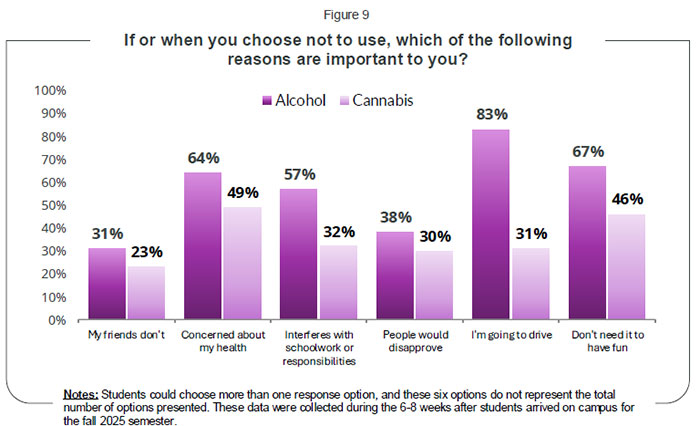 - Health: Students are increasingly reporting health reasons as their motivation to abstain from alcohol, with 64% citing negative health consequences, which is up from 55% in 2023.