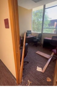 Damage to the door of an FSU office after law enforcement responded to a shooting on campus. Photo courtesy Knox