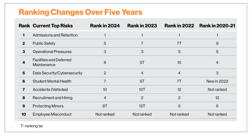 - Three top-10 risks — Public Safety, Facilities and Deferred Maintenance, and Vehicular Accidents saw higher response rates than in 2024, with Public Safety rising the most (up 6%).