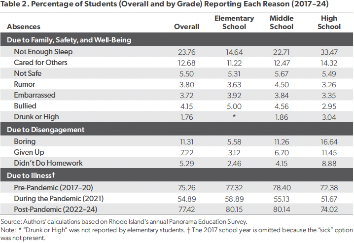The research, conducted by the American Enterprise Institute (AEI), aims to reduce chronic absenteeism by understanding the reasons why students miss school. Researchers used annual survey data from the Rhode Island Department of Education from 2017 through 2024 school years. The surveys, administered online between Martin Luther King Jr. Day and March 31 of each year to all students between grades 3-12 in every Rhode Island public school, asked students to self-report their reasons for missing school.